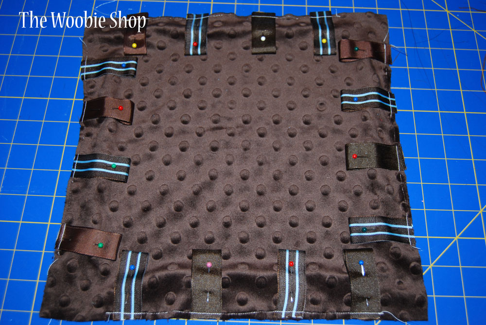 3- I took the minky and laid it right side up, then folded the ribbon in half and pinned it onto the RIGHT side of the minky with the raw edges pointing out toward the raw edges of the fabric. (Here you could do funky things with the ribbons or fabric pieces if you wanted to use fabric. I've seen people twist the ribbons, use thin and thick lengths of ribbons, some people don't even fold them, they sear one edge of the ribbon and then just have the ribbon like little flops off the end of the baby blanket.)